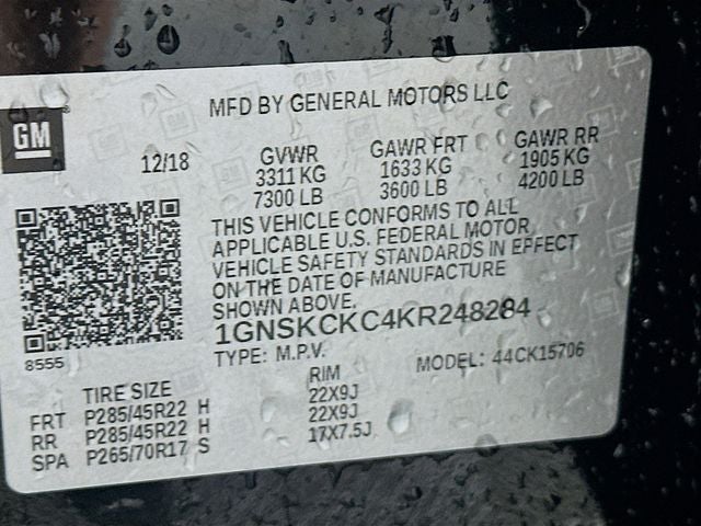 Black 4WD 6-Speed Automatic Electronic with Overdrive EcoTec3 5.3L V8 4WD, Black Leather, 1st & 2nd Row Color-Keyed Carpeted Floor Mats, 3rd Row 60/40 Power Fold Split-Bench, 4-Wheel Antilock Disc Brakes w/Brake Assist, 5 12-Volt Auxiliary Power Outlets, Auto-Dimming Inside Rear-View Mirror, Black Assist Steps w/Chrome Accent Strip, Bose Centerpoint Premium 10-Speaker Surround Sound, Cargo Net, Color-Keyed Carpeting Floor Covering, Driver Inboard & Front Passenger Airbags, Electronic Cruise Control w/Set & Resume Speed, Enhanced Driver Alert Package (Y86), Floor Console, Fog Lamps, Forward Collision Alert, Front & Rear Park Assist, Front Passenger 6-Way Power Seat Adjuster, Hands Free Power Liftgate, Heated & Ventilated Driver & Front Passenger Seats, Heated 2nd Row Seats, Heated Leather Wrapped Steering Wheel, IntelliBeam Headlamps, Lane Change Alert w/Side Blind Zone Alert, Lane Keep Assist w/Lane Departure Warning, Low Speed Forward Automatic Braking, Magnetic Ride Control Suspension Package, Memory Settings, Passive Entry System, Power Release 2nd Row Bucket Seats, Power Sunroof, Power Tilt & Telescopic Steering Column, Power-Adjustable Accelerator & Brake Pedals, Power-Folding Heated Outside Mirrors, Preferred Equipment Group 1LZ, Push Button Keyless Start, Rear Cross Traffic Alert, Rear Seat Blu-Ray/DVD Entertainment System, Remote Keyless Entry, Remote Vehicle Start, Roof-Mounted Luggage Rack Side Rails, SiriusXM NavTraffic, SiriusXM Radio, Sun, Entertainment & Destinations Package, Universal Home Remote, Wireless Charging.